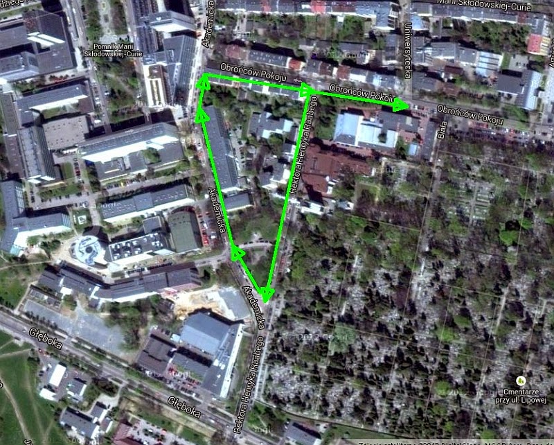 Układ ulic z kontraruchem w rejonie ul. Akademickiej, Raabego i Obrońców Pokoju. Po wprowadzeniu tego rozwiązania rowerzyści będą mieli krócej, a kierowcy nie będą musieli tak często jechać za rowerzystą na całym odcinku jednokierunkowym.